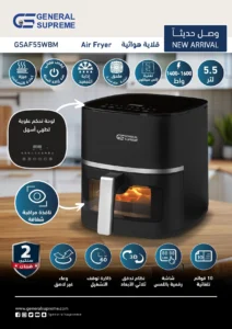 جنرال سوبريم قلاية هوائية, سعة 5.5 لتر, تقنية إكس سيكلون, ميزة إعادة التسخين, اذابة التجميد, 1600 واط. أسود