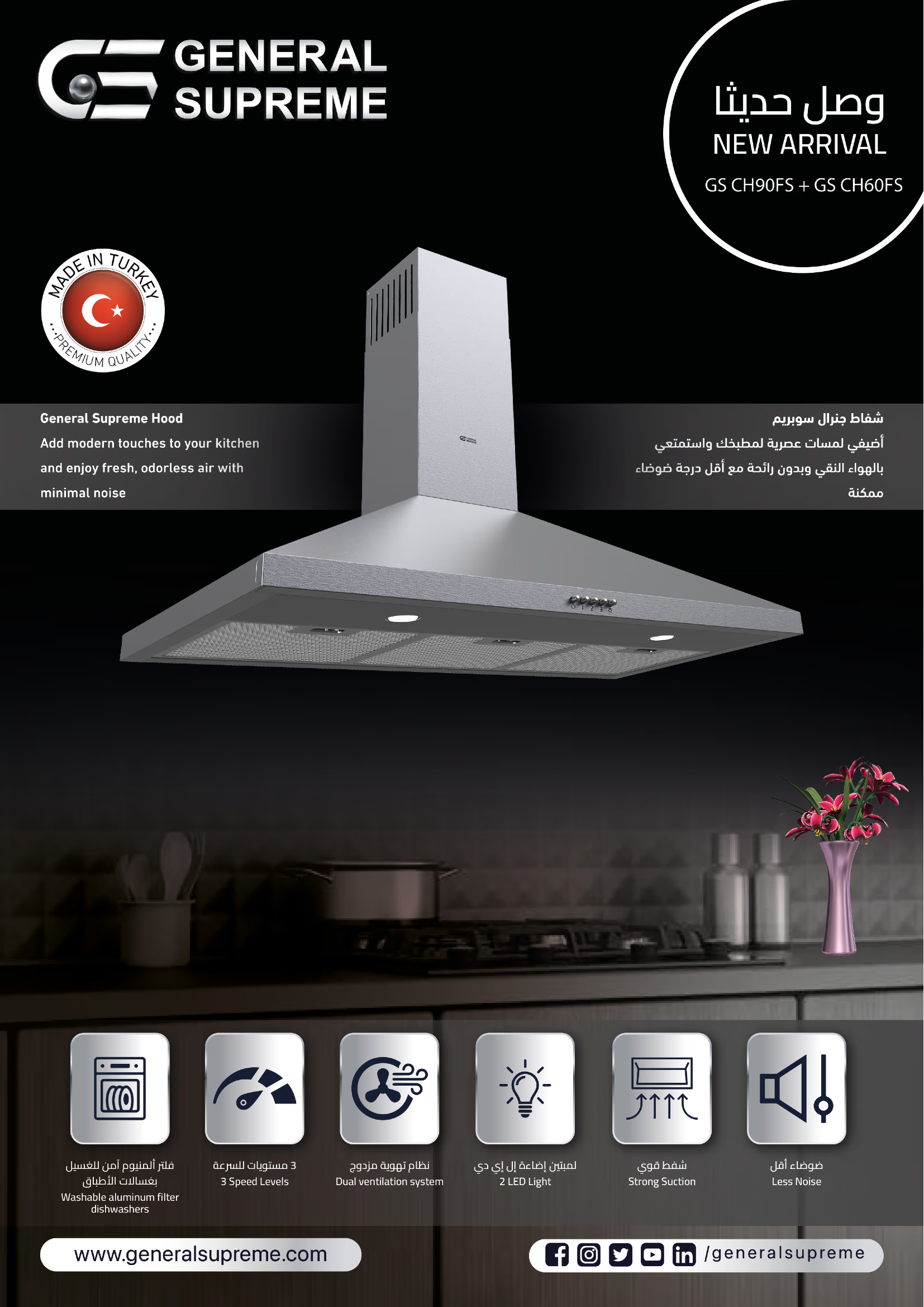 كن أول من يقيم “جنرال سوبريم , شفاط مدمج جداري مع مدخنة تصميم هرمي 60سم , معدل الشفط 450 م 3 / ساعة , 3 سرعات للمروحة ,ستانلس ستيل”