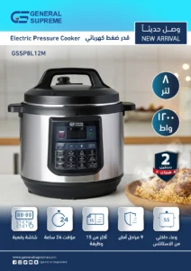 جنرال سوبريم قدر ضغط كهربائي متعدد الوظائف، سعة 8 لتر، 9 مراحل للامان، 1200 واط، سلفر,