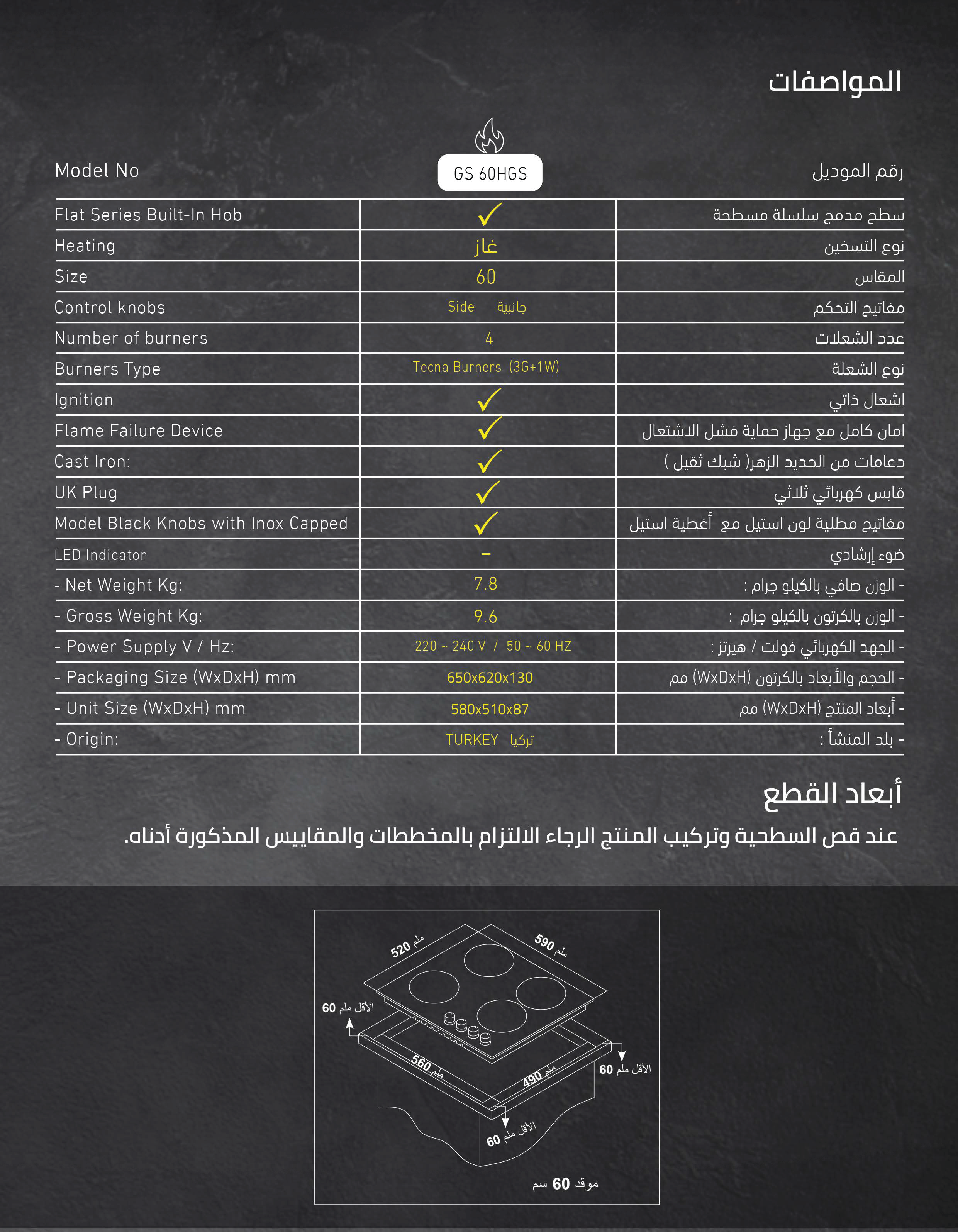 فرن جنرال سوبريم بلت ان – سطح غاز مدمج (بلت إن) 60 سم | 4 شعلات قوية!