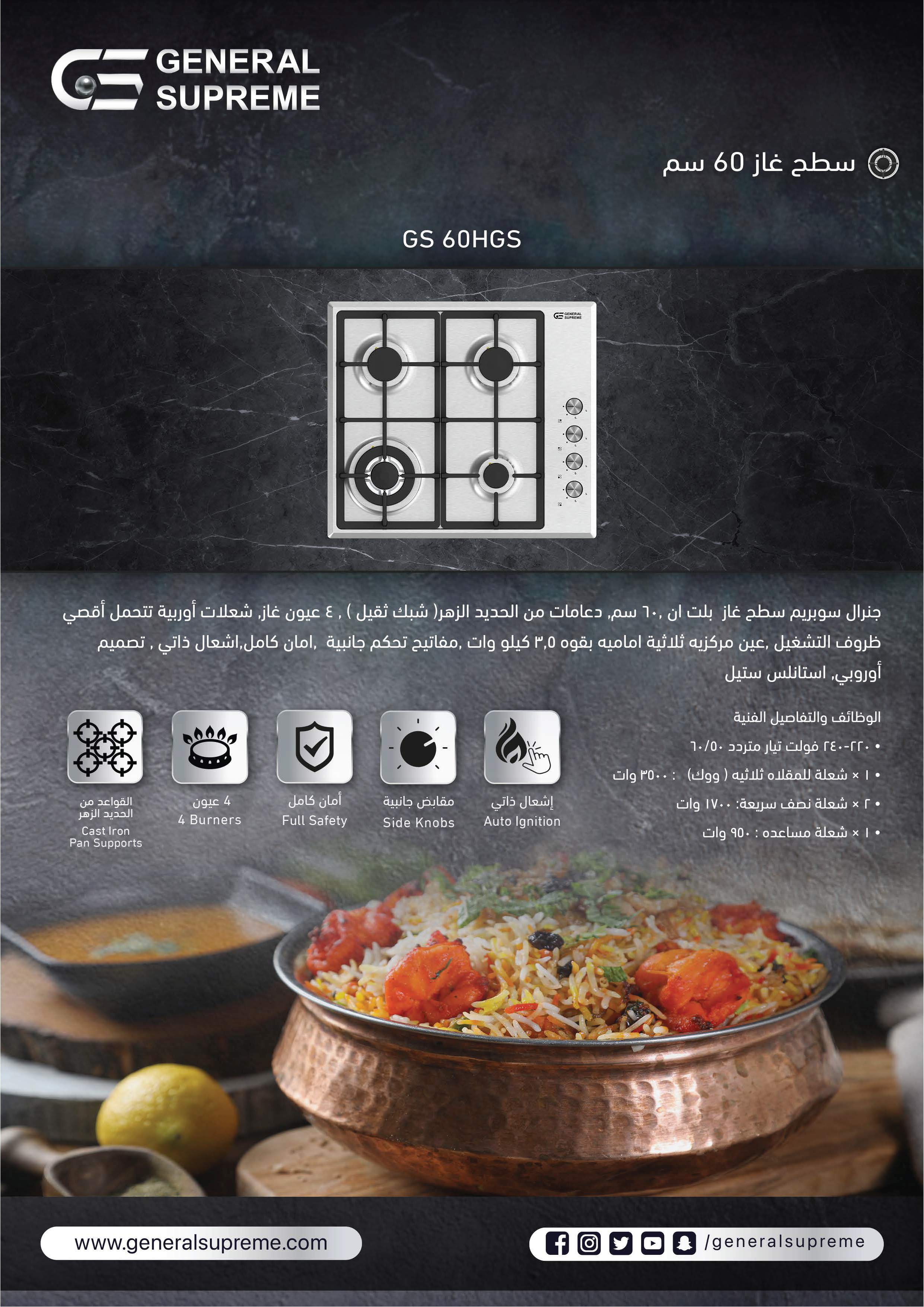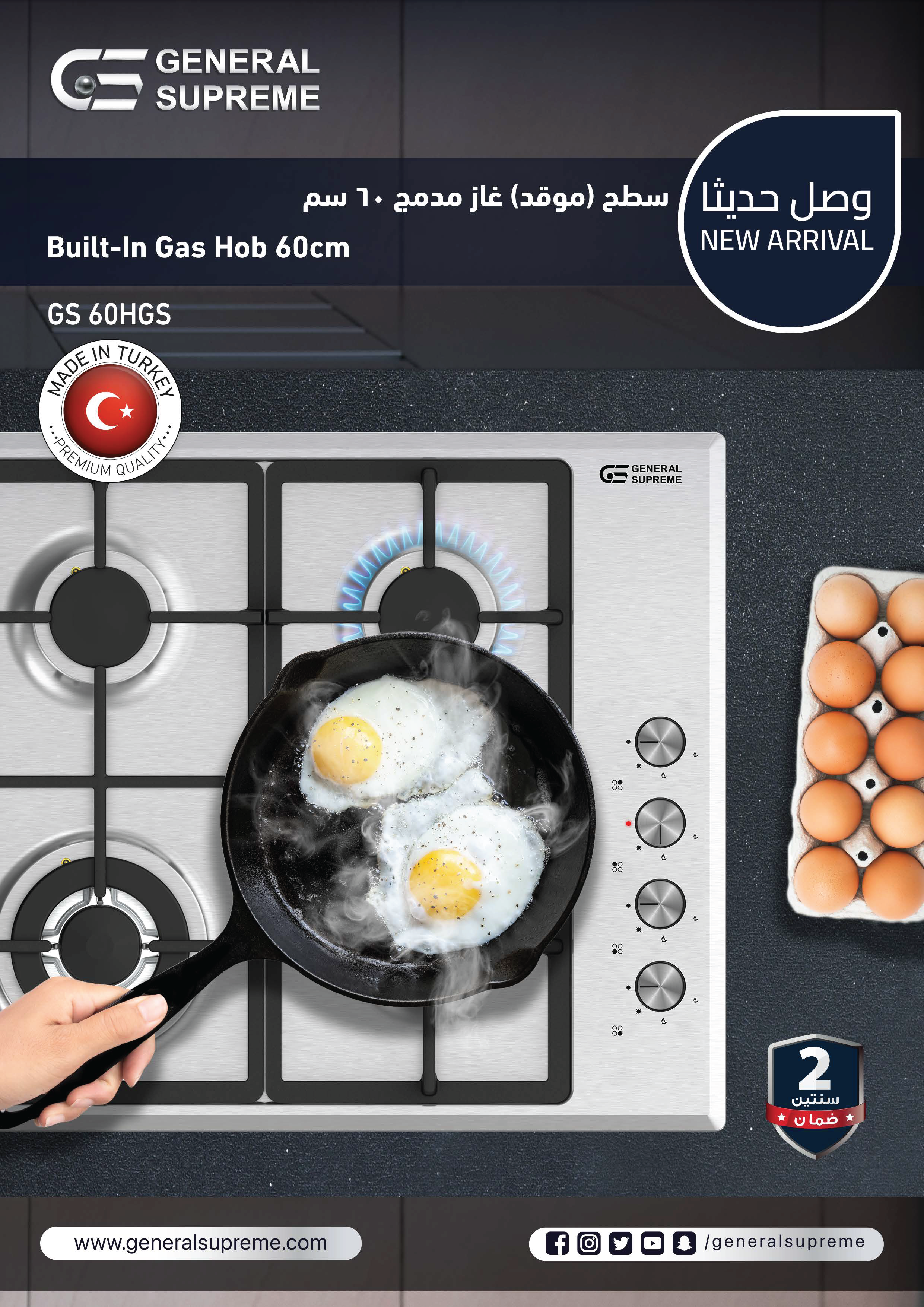 جنرال سوبريم بلت ان سطح غاز 60 سم 4 عيون الحديد زهر, أمان كامل, استيل تركيا GS60HGS