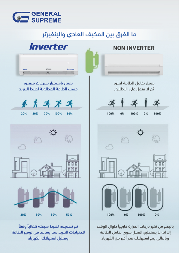 ج: نعم، بفضل تقنية الانفيرتر الذكي يستهلك كهرباء أقل بنسبة تصل إلى 50%.